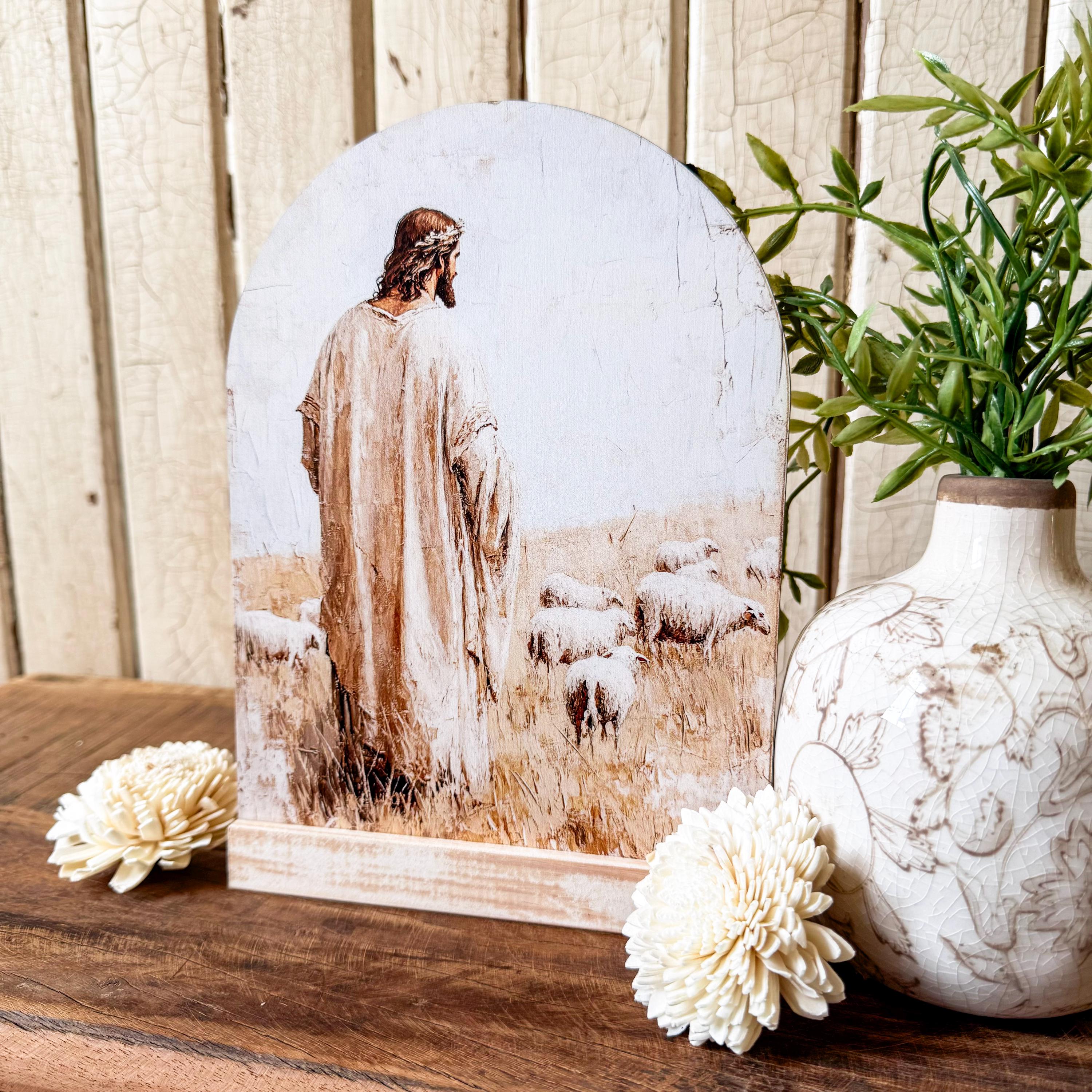 Jesus with Sheep Arched Wood Sign Shelf Sitter, Spring Wall Art, Easter Art Print, Jesus Art Print, Unique Wood Sign, Arched Sign, Wood Sign