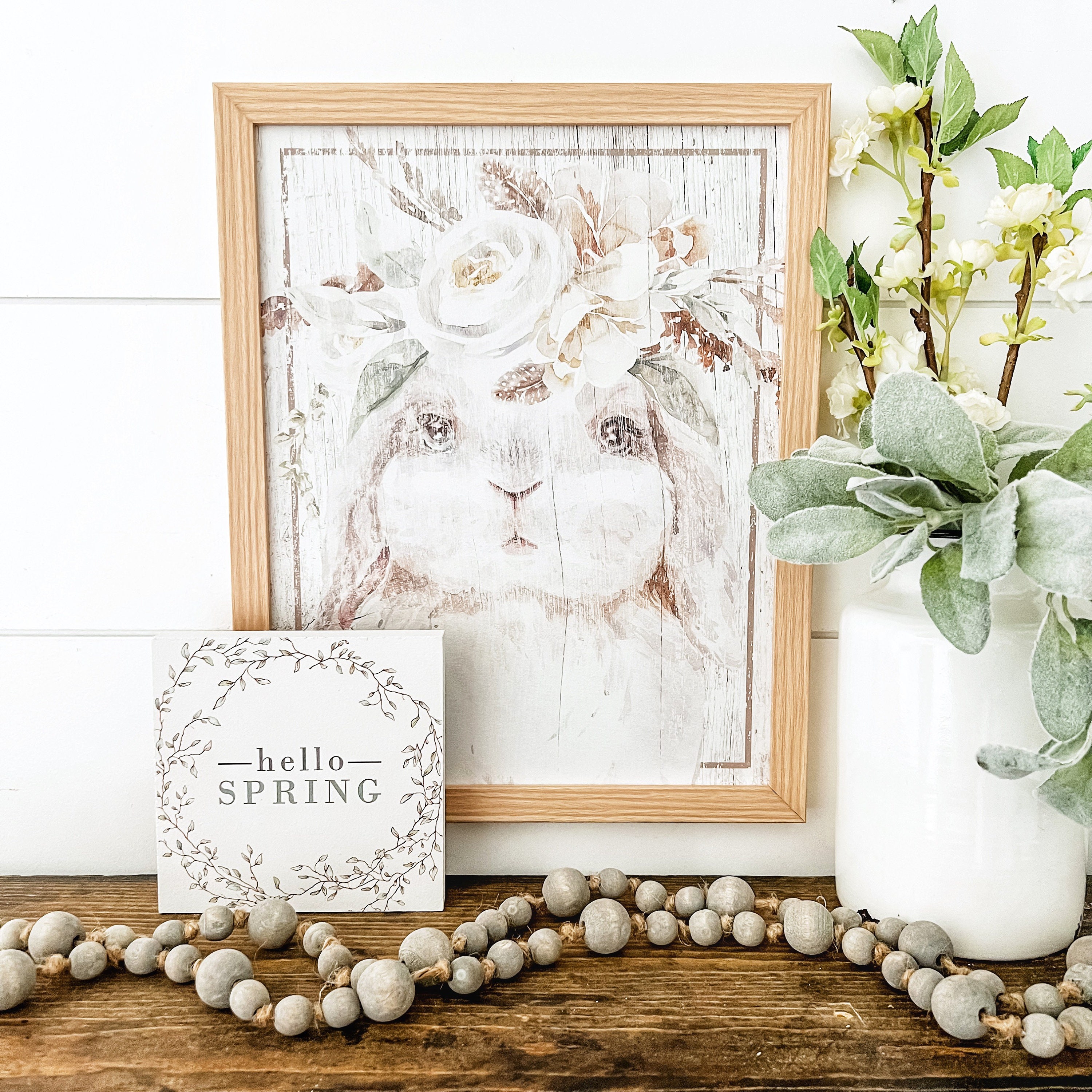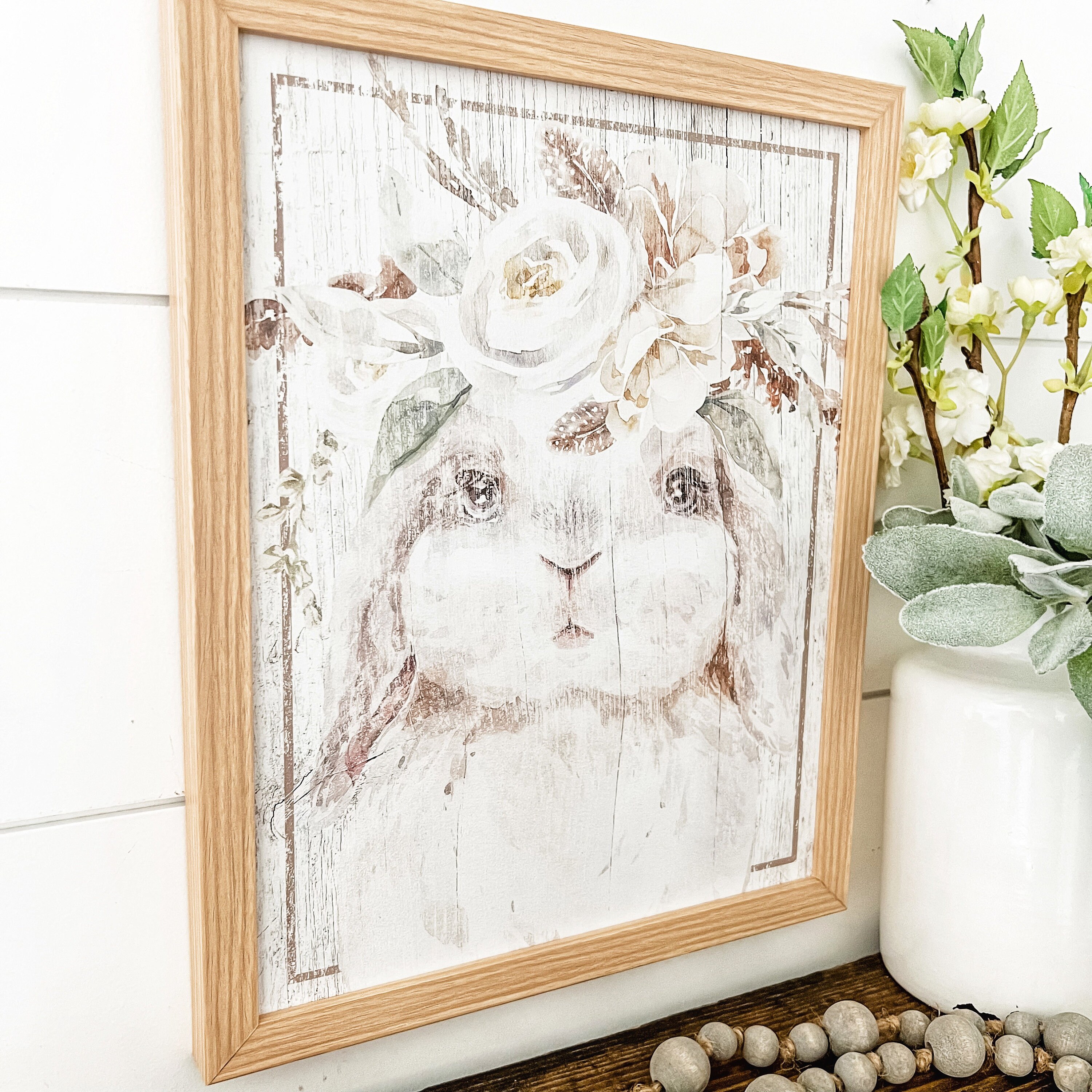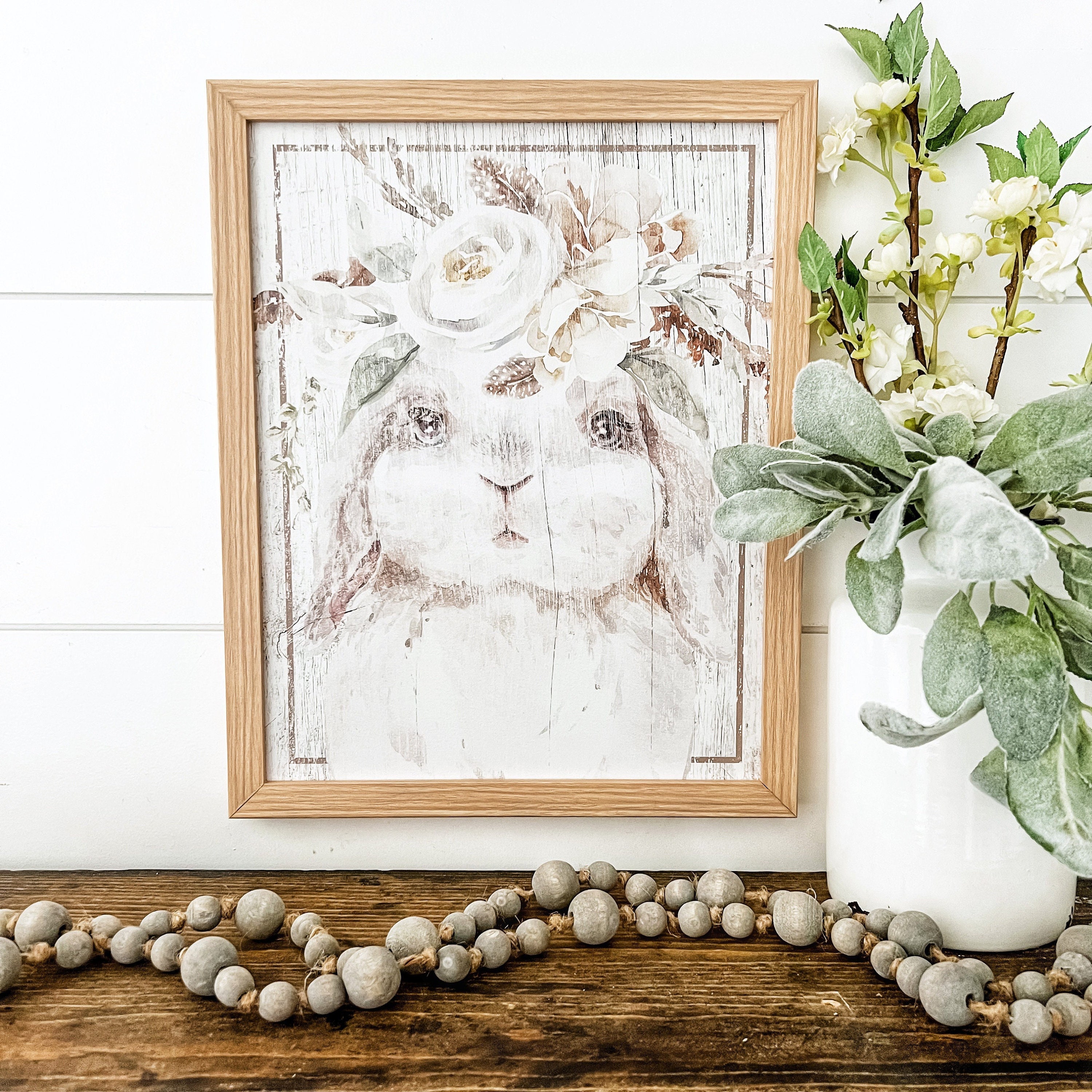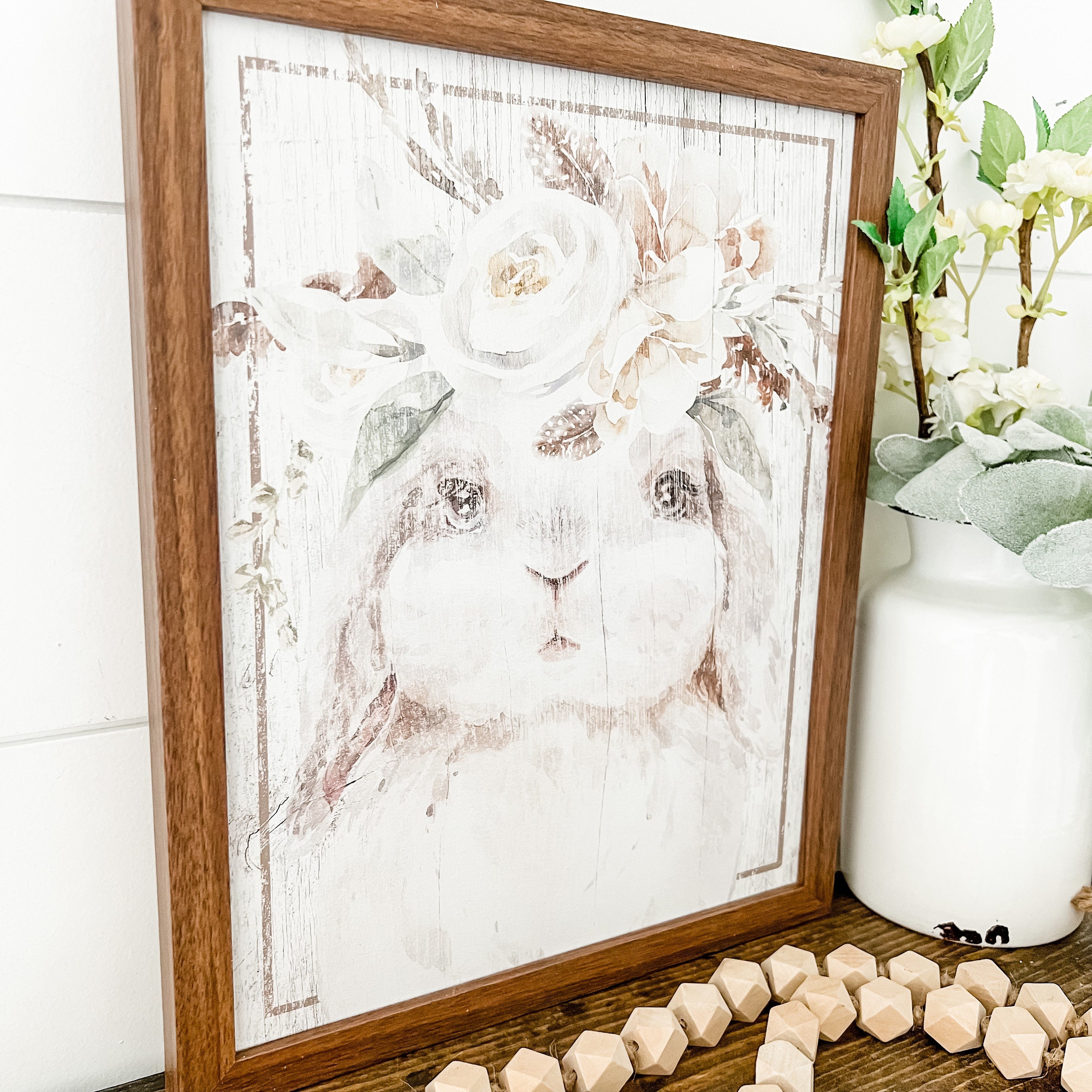 Spring farmhouse wooden sign with vintage bunny/rabbit with a floral crown. Perfect piece for spring!
