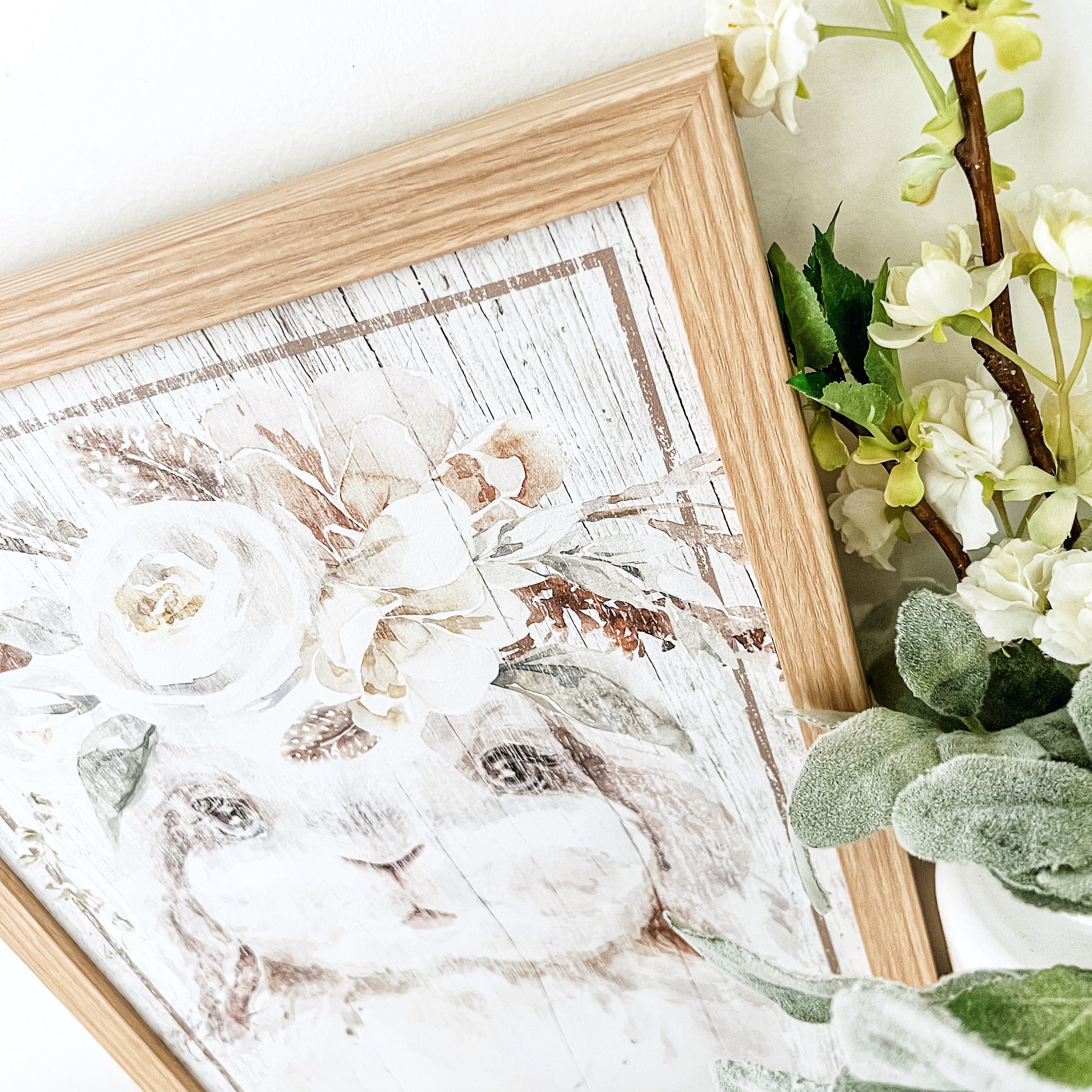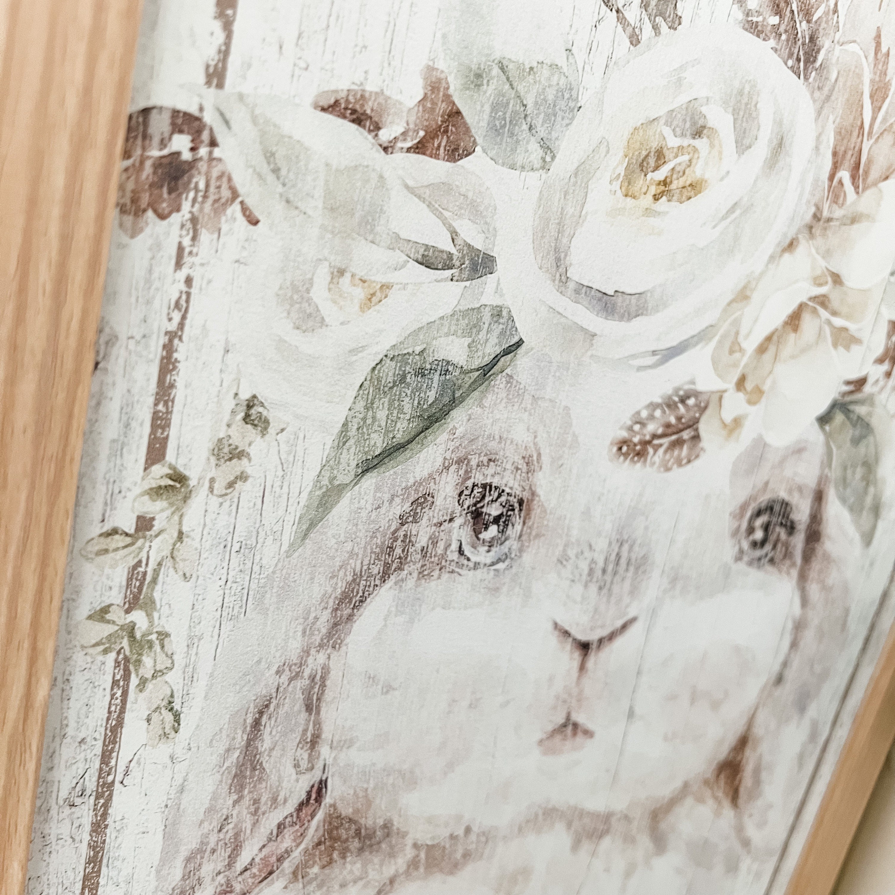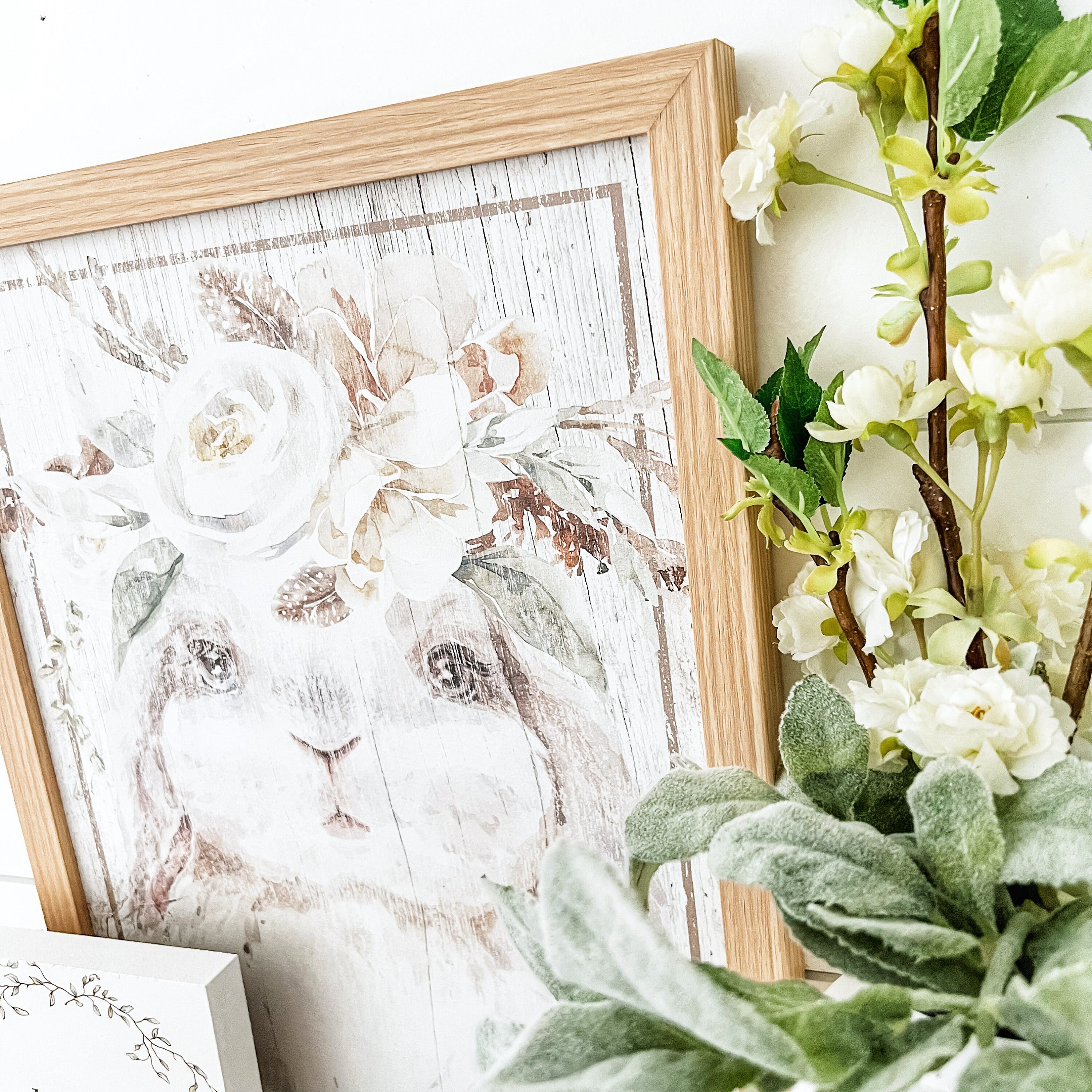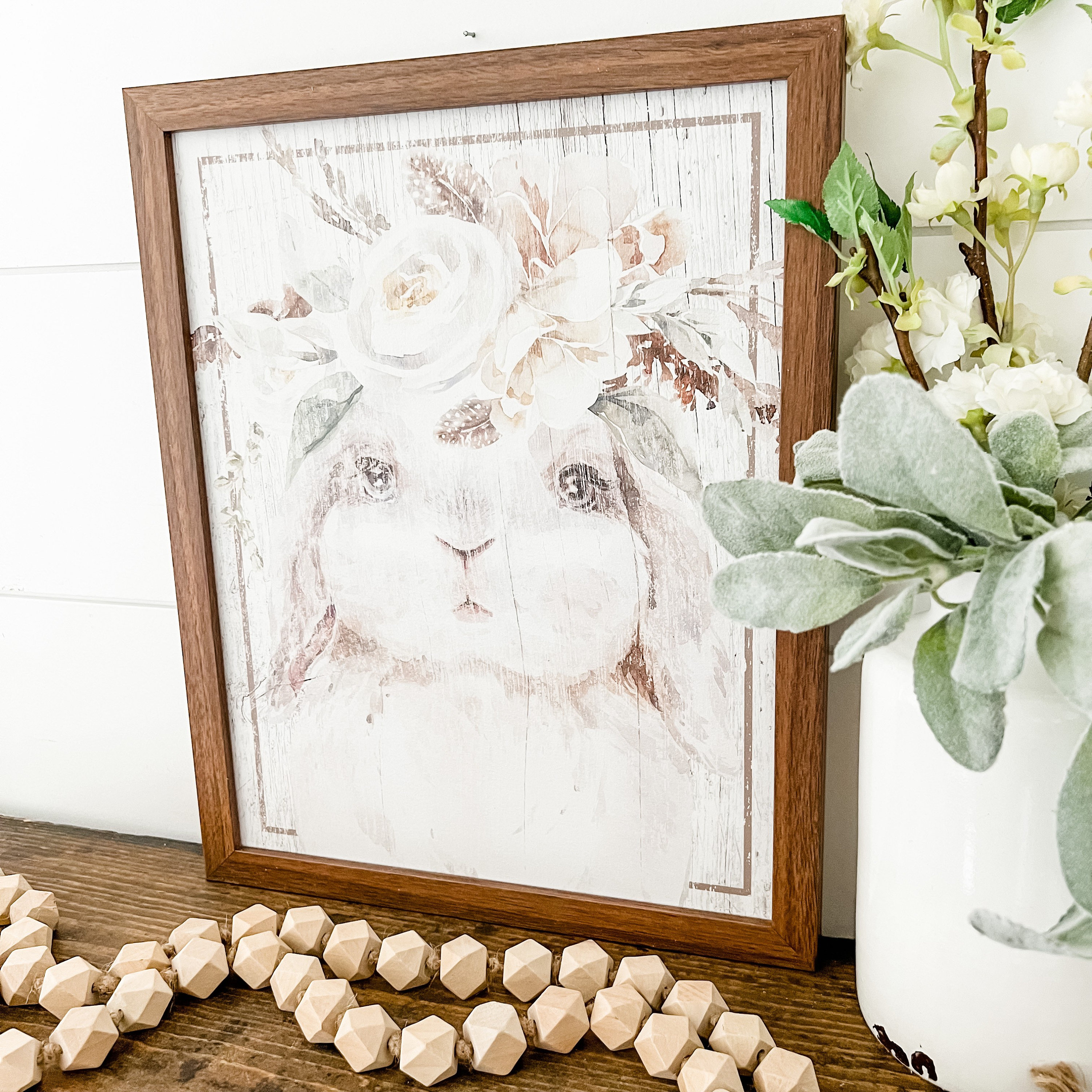 Spring farmhouse wooden sign with vintage bunny/rabbit with a floral crown. Perfect piece for spring!