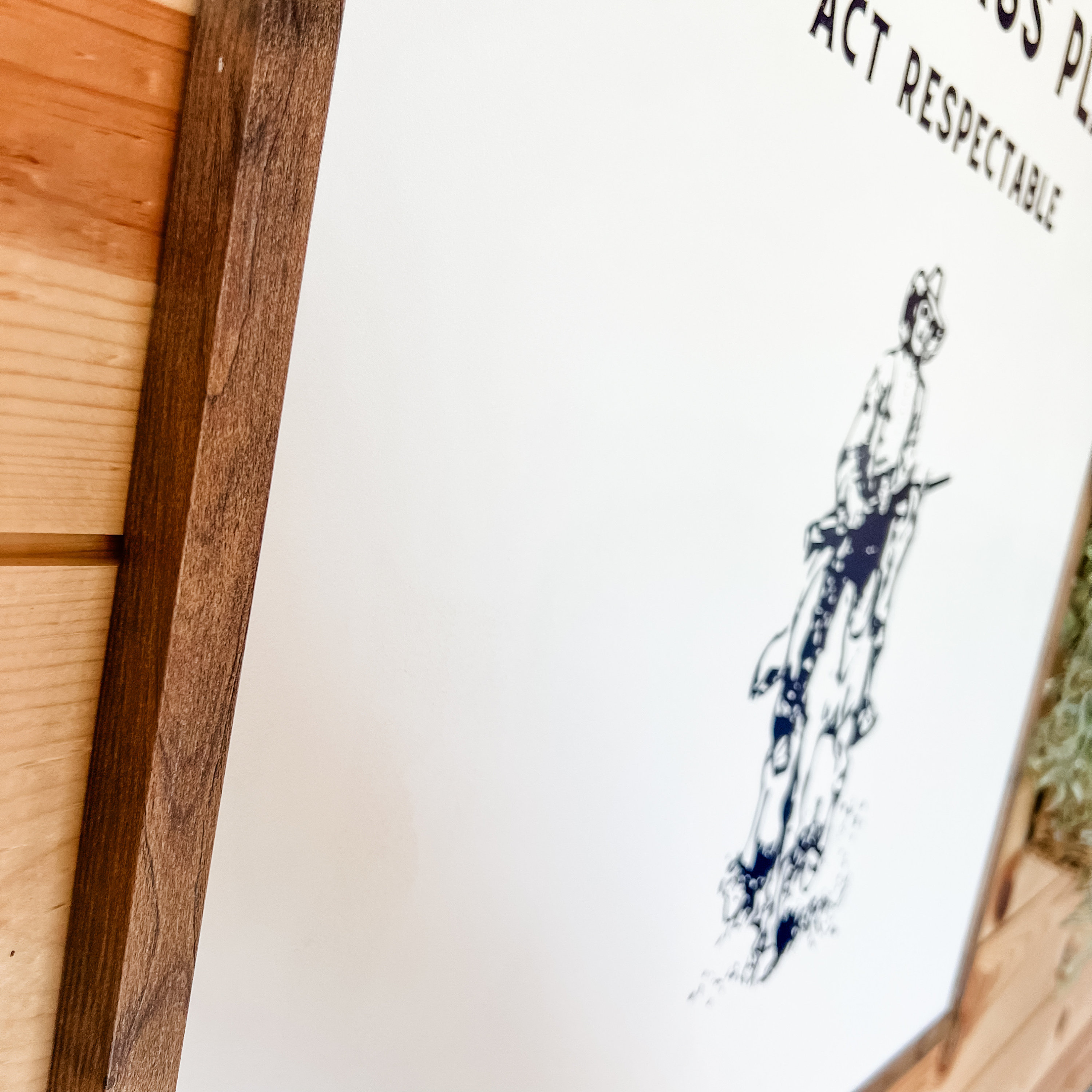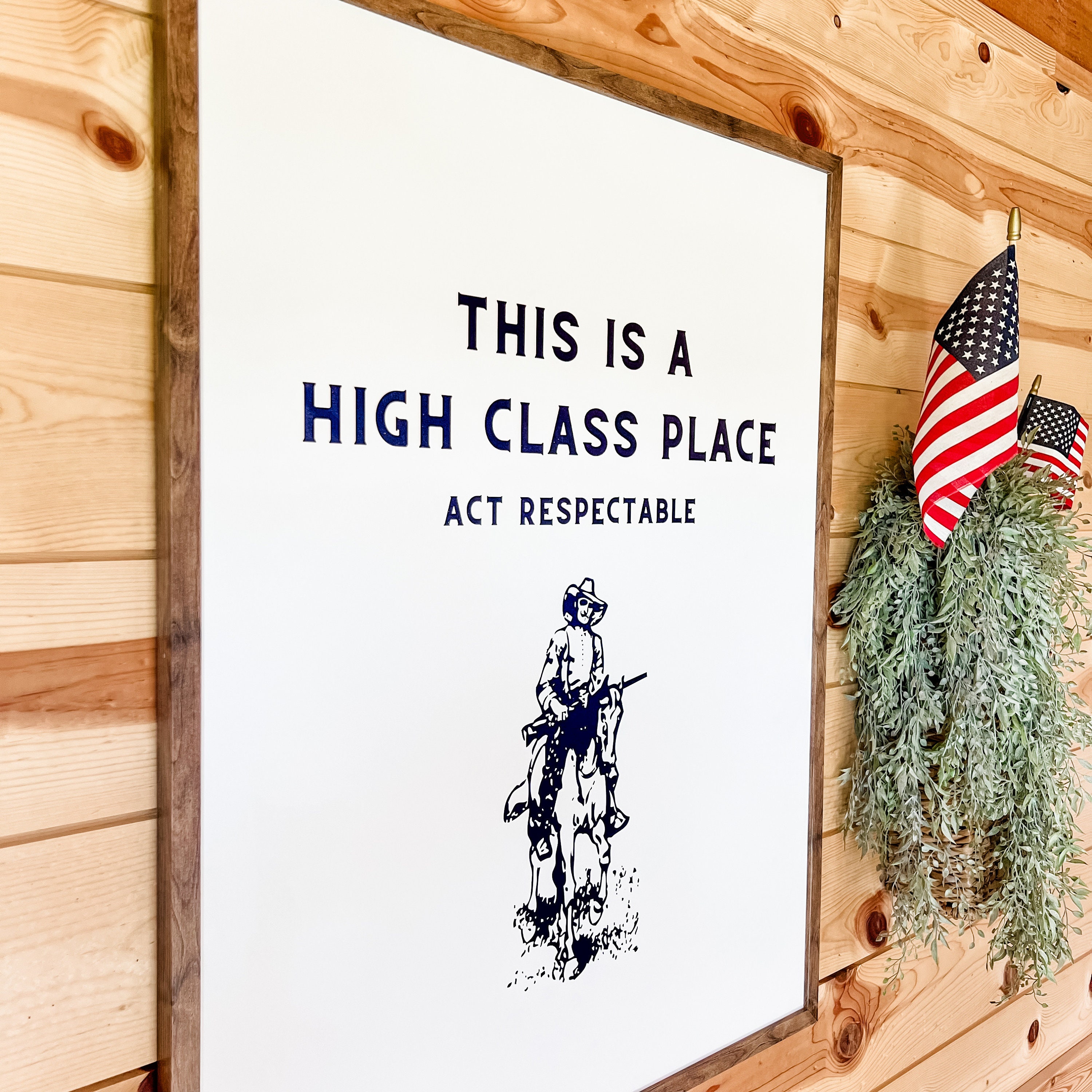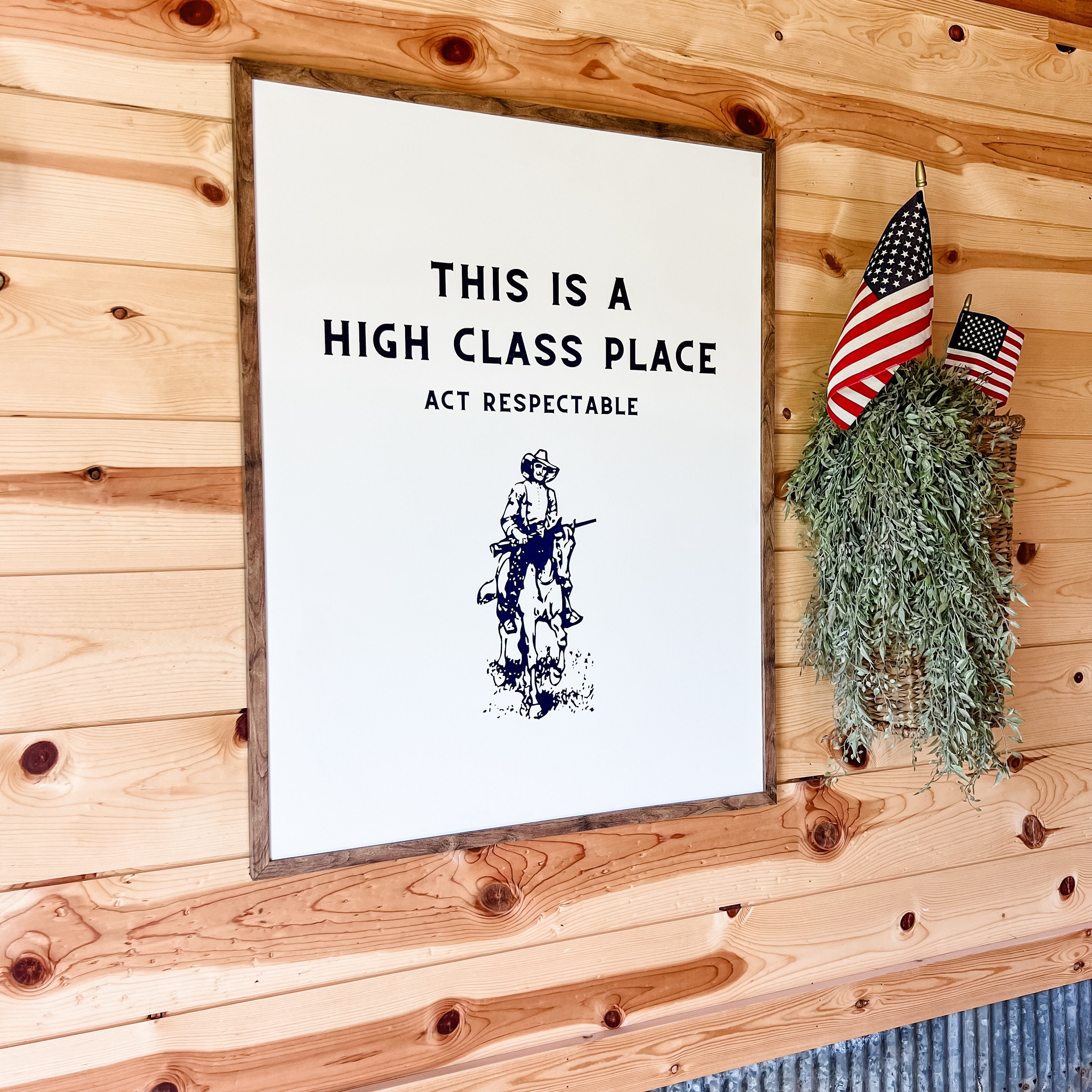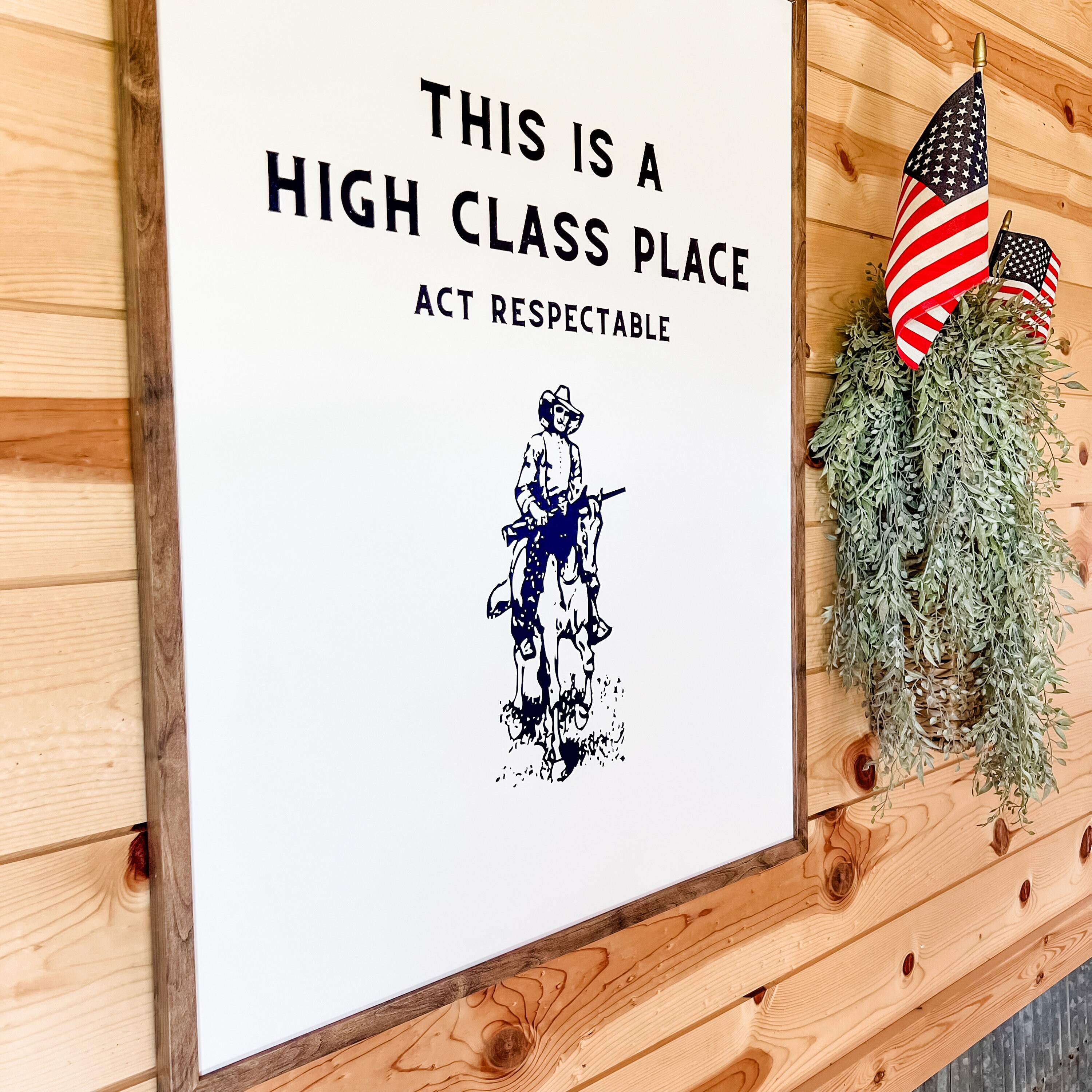 Handmade wooden sign with 'This is a high class place, act respectable' saying on it. Modern and western in style and printed directly on wood and framed in the frame color of your choice. Perfect for a statement piece or to add to a shelf.
